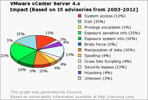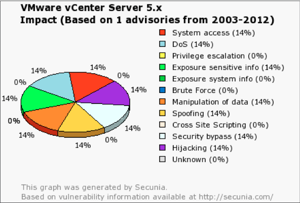 Khi nhìn vào số liệu thống kê từ Secunia, ta thấy rằng hai kết quả đầu tiên là System Access và DoS, System Access trên ESXi có nghĩa là cho phép kẻ tấn công truy cập vào tất cả mọi thứ trên môi trường ảo hóa. Còn vCenter, hãy nhìn vào Hình 5 và 6.