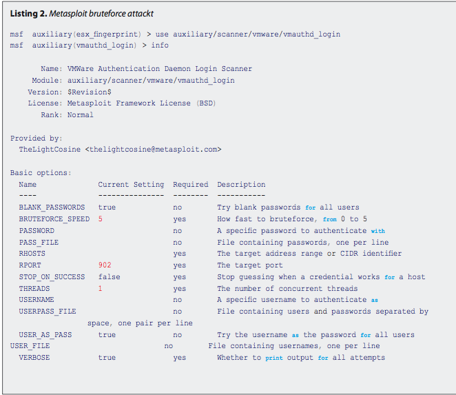 Giờ ta đã xác định được thông tin về máy chủ và phiên bản VMware, nhìn vào đó chúng ta có thể đoán trước được khả năng khai thác thành công. Có khá nhiều sự lựa chọn; tuy nhiên chúng ta sẽ thử phương pháp dùng Metasploit để Bruteforce tài khoản đăng nhập vào ESXi!